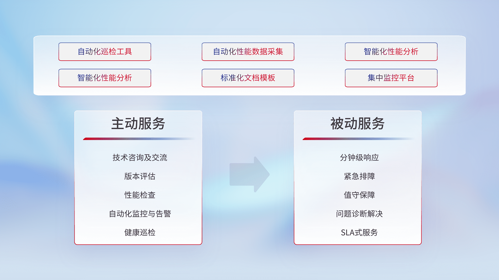 智能化工具和标准化文档,,保障服务质量,,,提供主动服务(包含技术咨询、、版本评估、、、、性能检查、、自动化监控与告警、、健康巡检)和被动服务包含(分钟级响应、、、、紧急排障、、、、值守保障、、问题诊断解决、、SLA服务)。。。