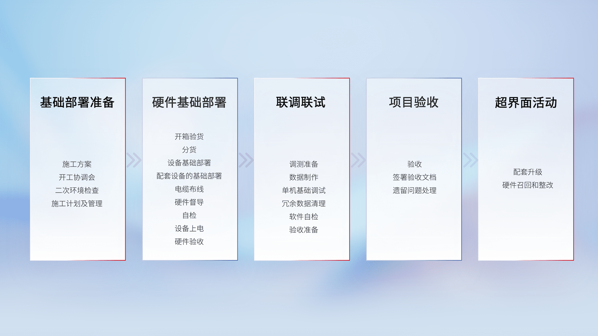 从基础部署准备、、、、硬件基础部署、、、联调联试、、、项目验收、、、、越界面活动的全过程可追溯,,,,保证施工质量和进度。。。